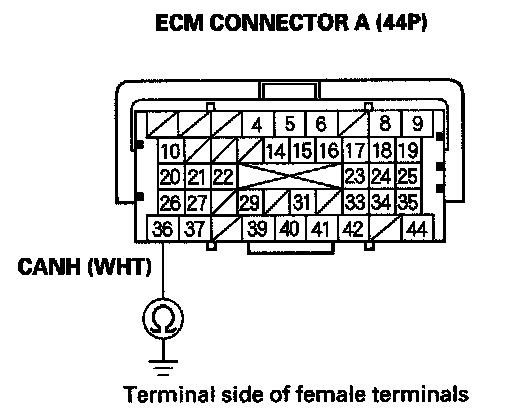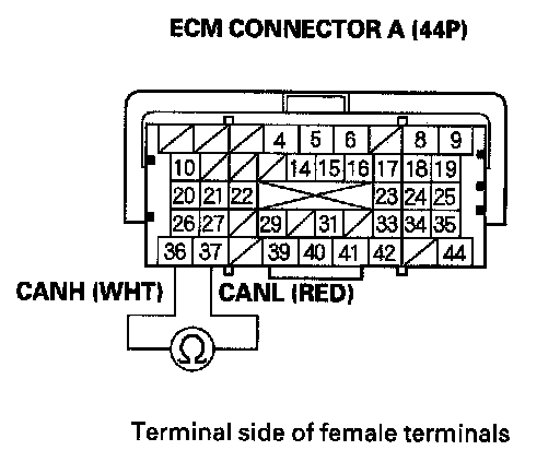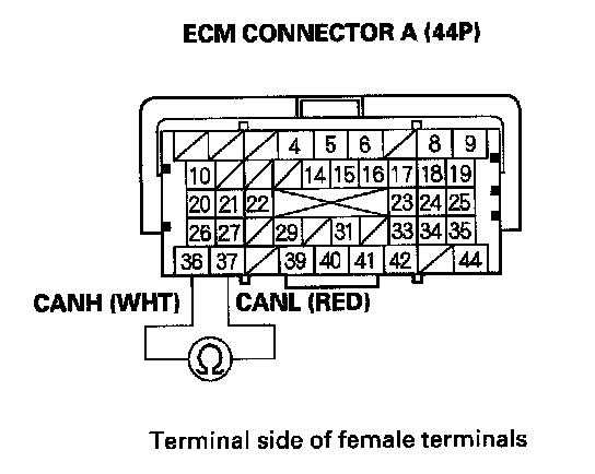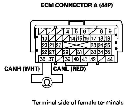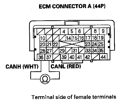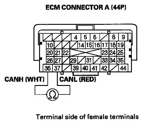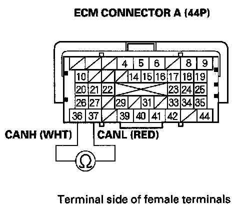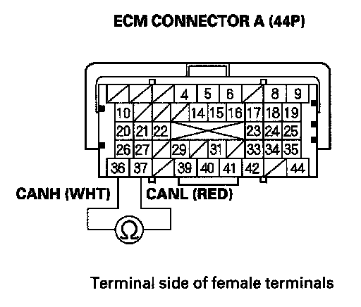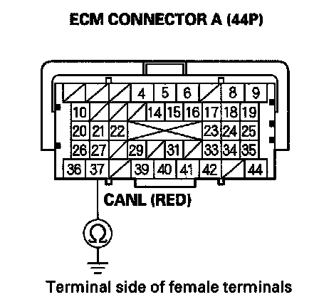 38. Measure resistance between ECM connector terminals A36 and A37.