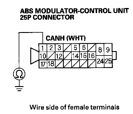 12. Check for continuity between ABS modulator-control unit 25P connector terminal No.1 and body ground.