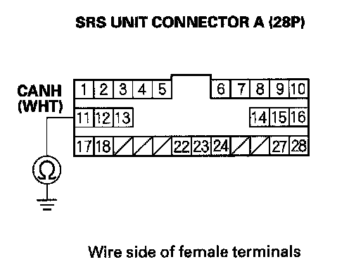 15. Check for continuity between SRS unit connector A (28P) terminal No.11 and body ground.