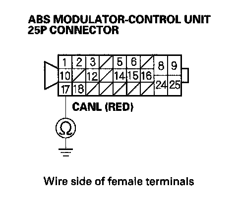 20. Check for continuity between ABS modulator-control unit 25P connector terminal No.17 and body ground.