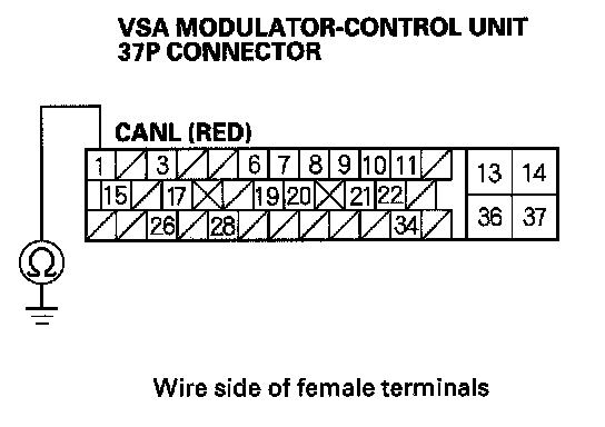 13. Check for continuity between VSA modulator-control unit 37P connector terminal No.15 and body ground.