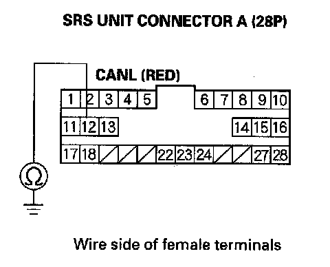 23. Check for continuity between SRS unit connector A (28P) terminal No.12 and body ground.