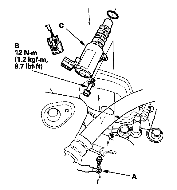 3. Remove the bolt (B) and the VTC oil control solenoid valve (C).