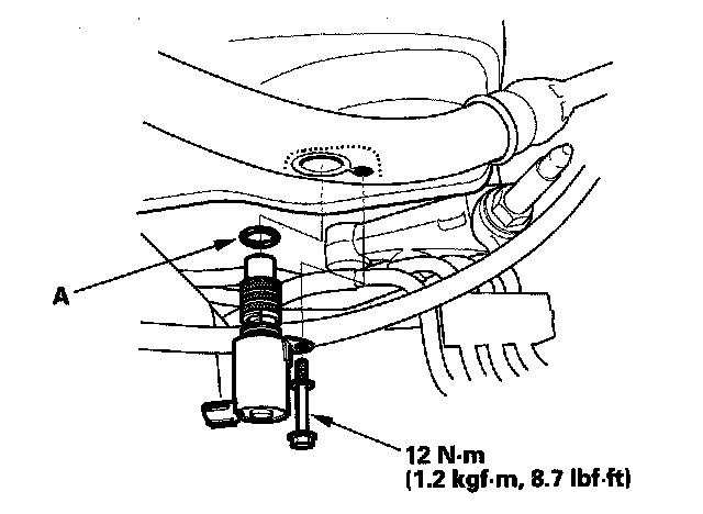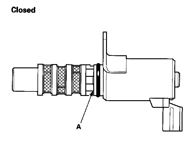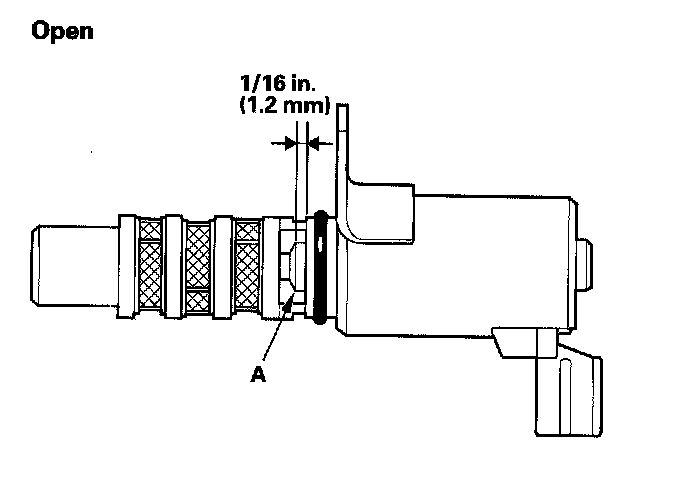7. Connect the battery negative terminal to VTC oil control solenoid valve 2P connector terminal No.1. Appearance of inner valve (A) in the port should be at least 1/16 in. (1.2 mm). IF the inner valve does not open, replace it; then go to step 7.