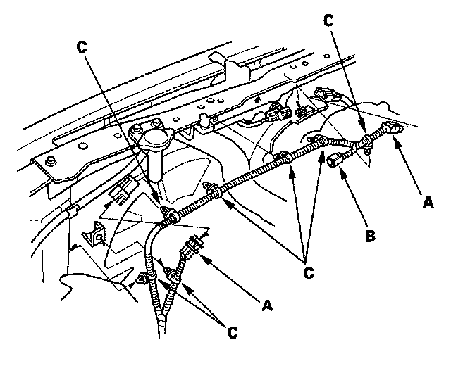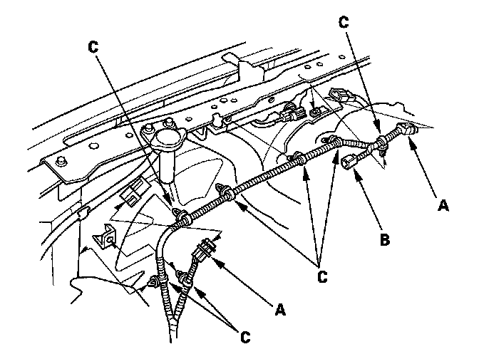 5. Disconnect the fan motor connectors (A) and hood switch connector (B), then remove the harness clamps (C).