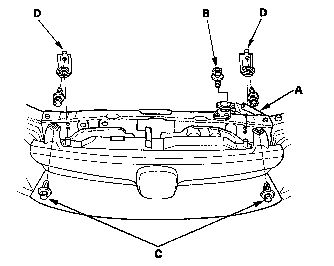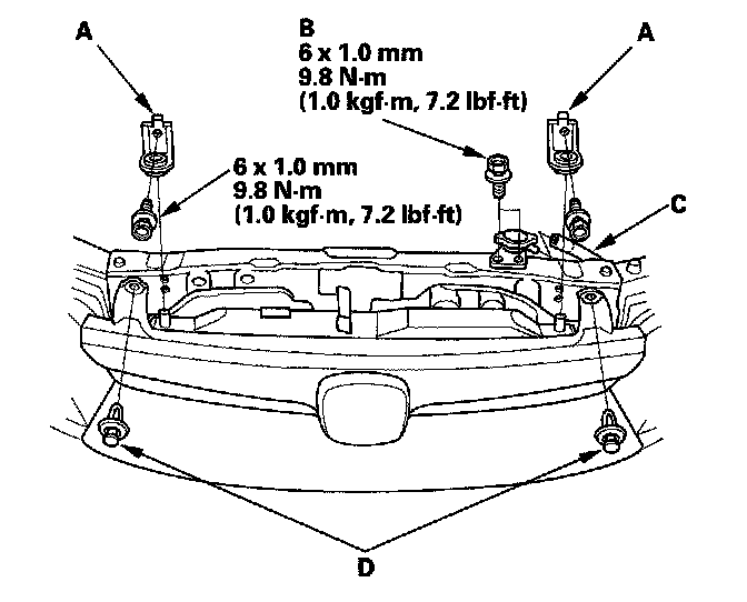 6. Remove the reservoir hose (A), radiator cap base mounting bolts (B), clips (C) and radiator upper brackets (D).