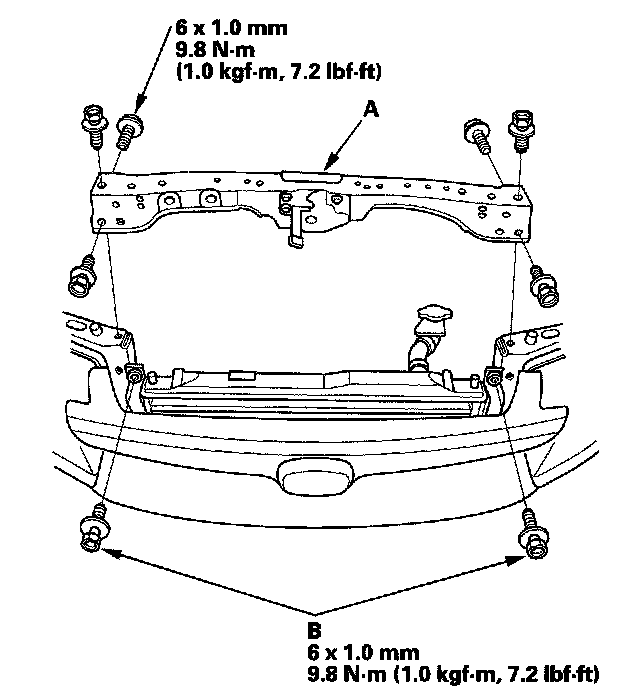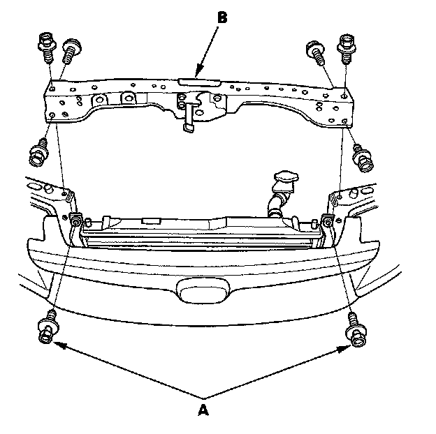 7. Remove the condenser bracket mounting bolts (A), then remove the bulkhead (B).