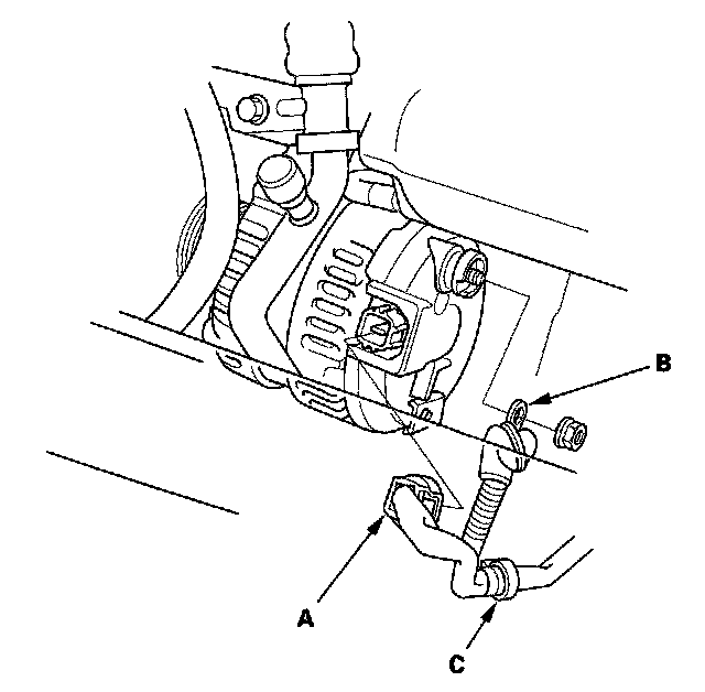 9. Disconnect the alternator connector (A), BLK wire (B) and harness clamp (C) from the alternator, then remove the alternator.