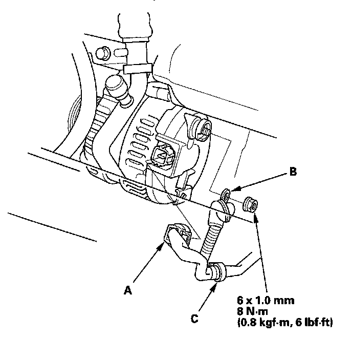1. Connector the alternator connector (A), BLK wire (B) and harness clamp (C) to the alternator.