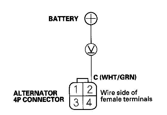 7. Measure the voltage between alternator 4P connector terminal No.2 and the positive terminal of the battery.
