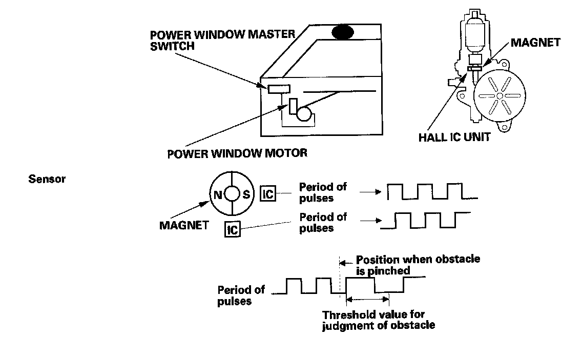 The driver's power window motor incorporates a pulser which generates pulses during the motor's operation and sends the pulses to the driver's power window control unit. As soon as the power window control unit detects no pulses from the pulser, the driver's power window control unit makes the power window motor stop and reverse. If the window is more than halfway closed, it will reverse to half open position. If the window is less than halfway closed, it will stop and reverse about 2 inches. This is to prevent pinching an obstacle during auto-up operation. The auto reverse operation is not active when the switch is held in the up position.