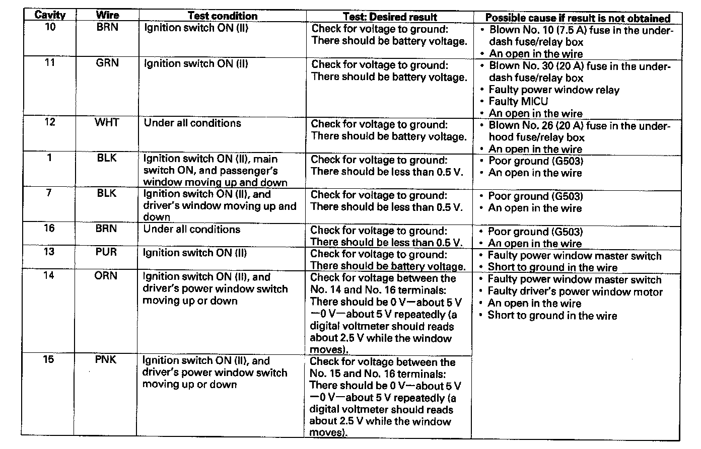 5. Reconnect the 16P connector to the power window master switch. Turn the ignition switch ON (II), and make these input tests at the connector.