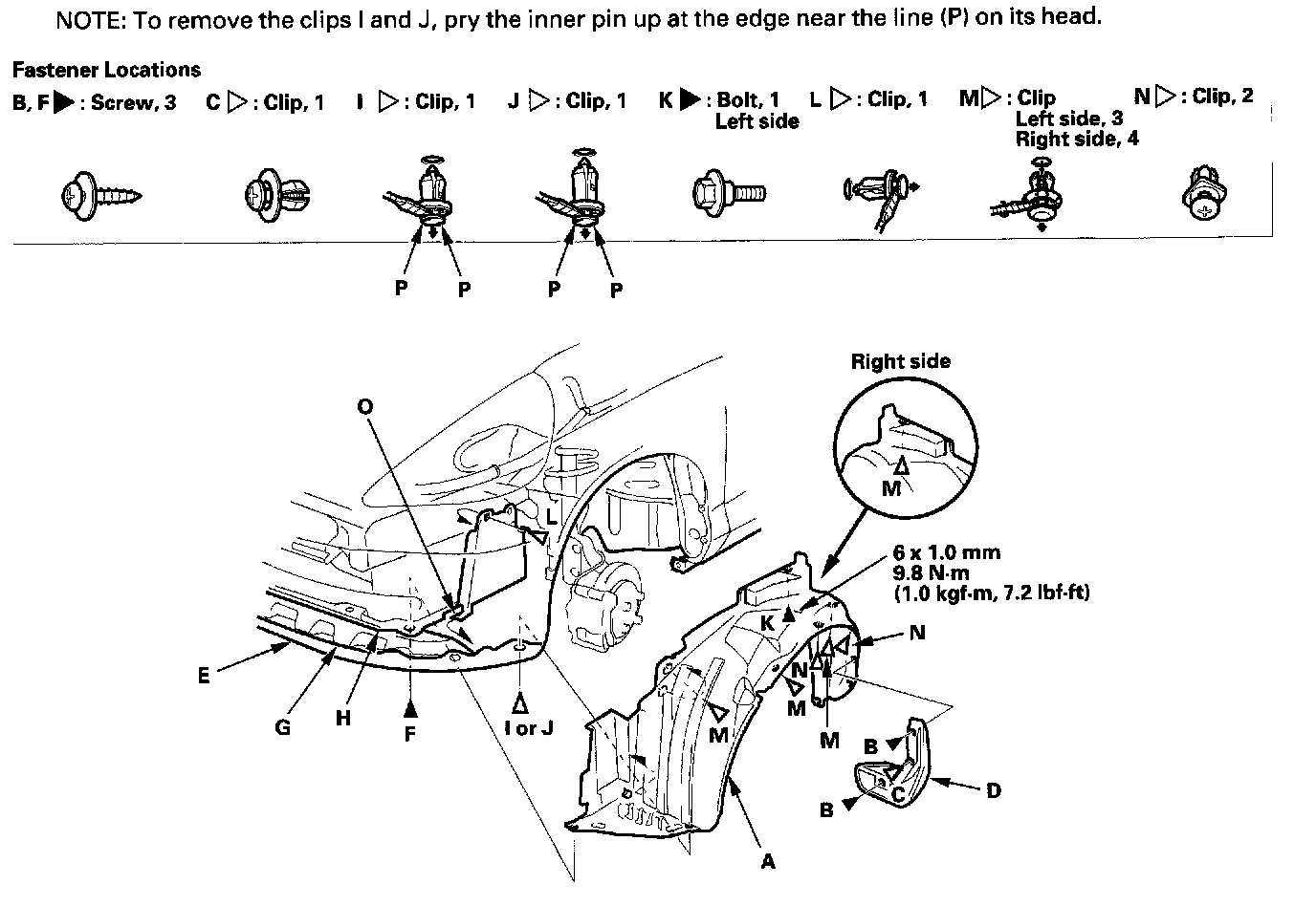 3. From the wheel arch, remove the bolt (K) (left side) and clips (L, M, N) that secure the front inner fender (and splash shield) to the body.
