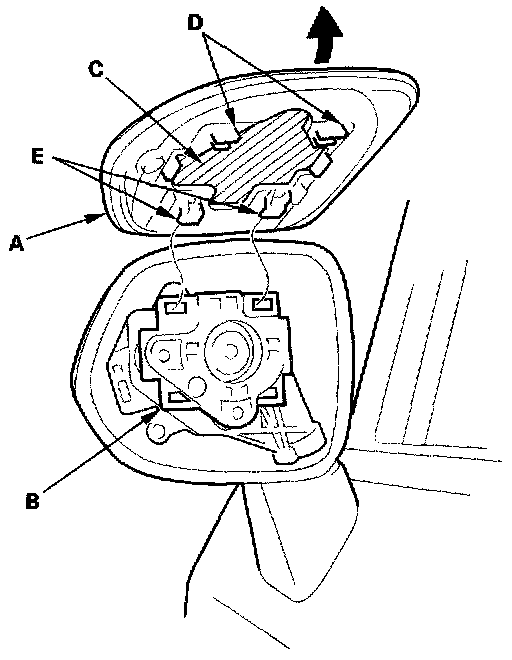 2. Separate the mirror holder from the actuator (B) by slowly pulling them apart while separating the adhesive portion (C), detaching the clips (D), and releasing the hooks (E).
