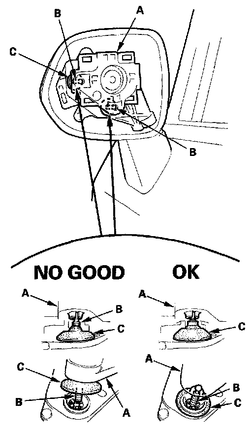 3. Before reinstalling the mirror holder to the inner holder (A) of the actuator, check the actuator rods (B) and the actuator boots (C):