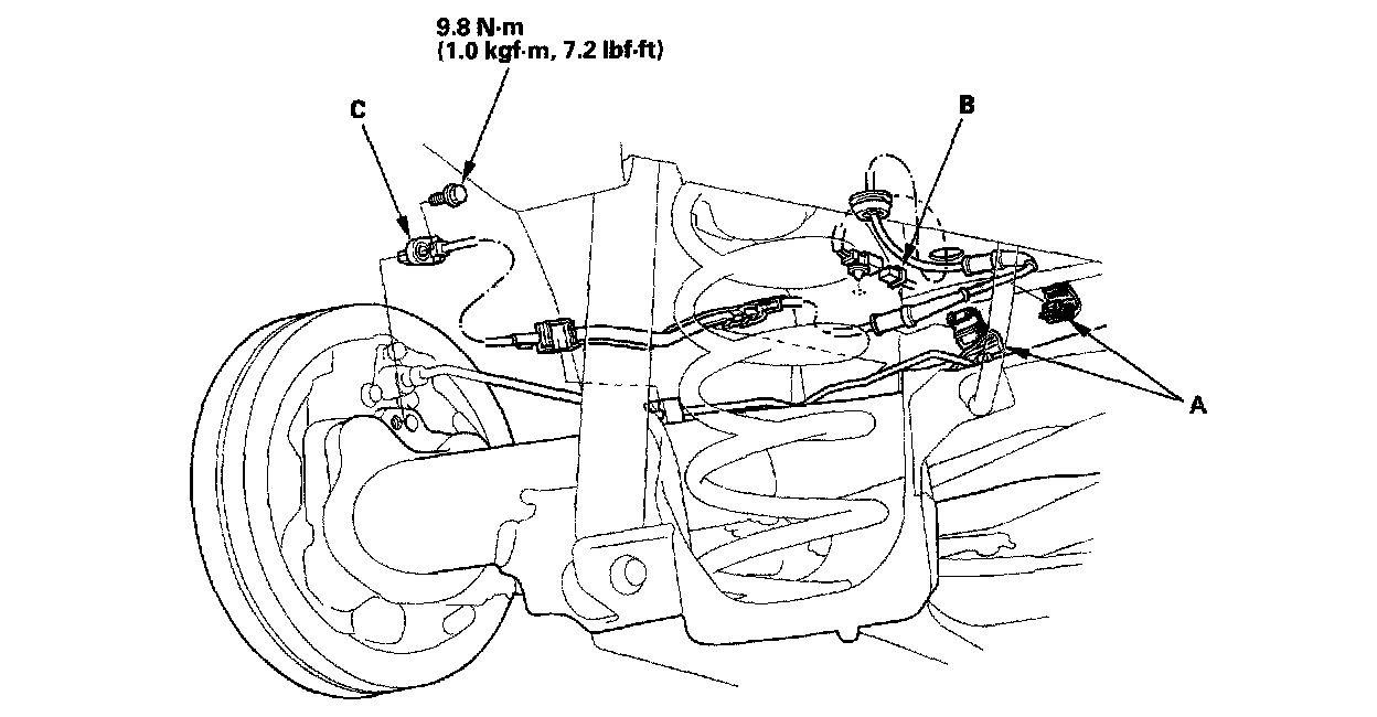 2. Remove the clips, the bolt, and the wheel sensor (C).