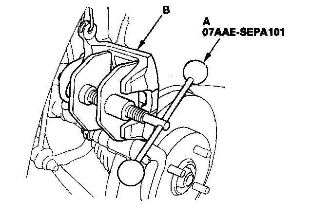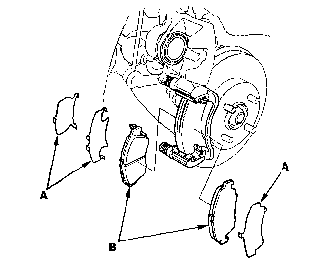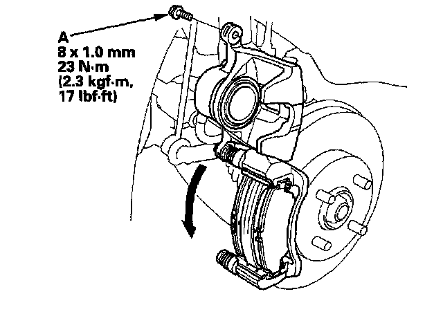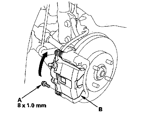 4. Remove the flange bolt (A), and pivot the caliper (B) up out of the way. Check the hose and pin boots for damage and deterioration.