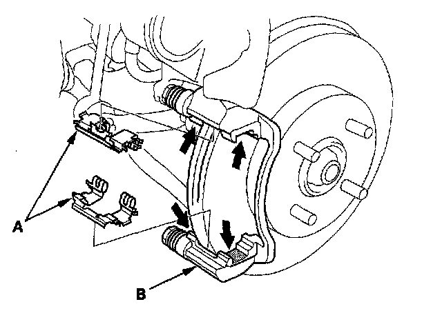 7. Clean the caliper bracket (B) thoroughly; remove any rust, and check for grooves and cracks.