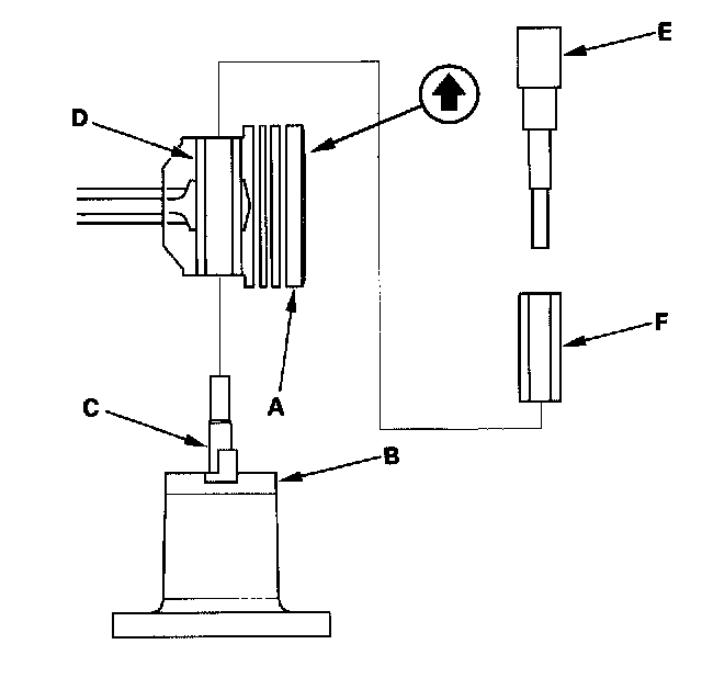 3. With the arrow on top of the piston and the embossed mark on the connecting rod facing up, place the piston assembly (B) on the special tool (C). Be sure you position the recessed flat area of the piston against the piston base head inserts (D) as shown.