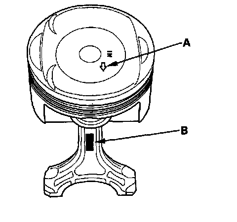 1. Assemble the piston with the arrow (A) pointing up and the connecting rod with the embossed marks (B) on the same side.