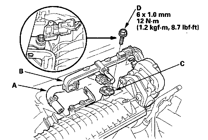 6. Install the brake booster vacuum hose (A), harness holder (B), manifold absolute pressure (MAP) sensor connector (C) and bolt (D).