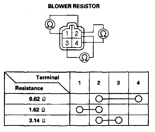 3. Measure the resistance between the following terminals of the blower resistor and compare them with the values in the table.