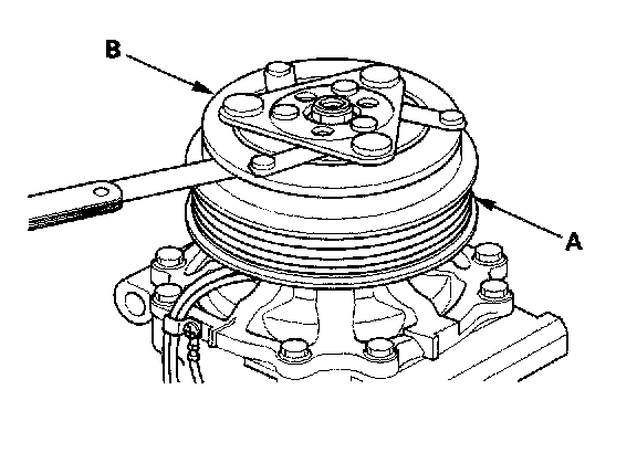 3. Measure the clearance between the rotor pulley (A) and the armature plate (B) all the way around. If the clearance is not within specified limits, remove the armature plate and add or remove shims as needed to increase or decrease clearance.