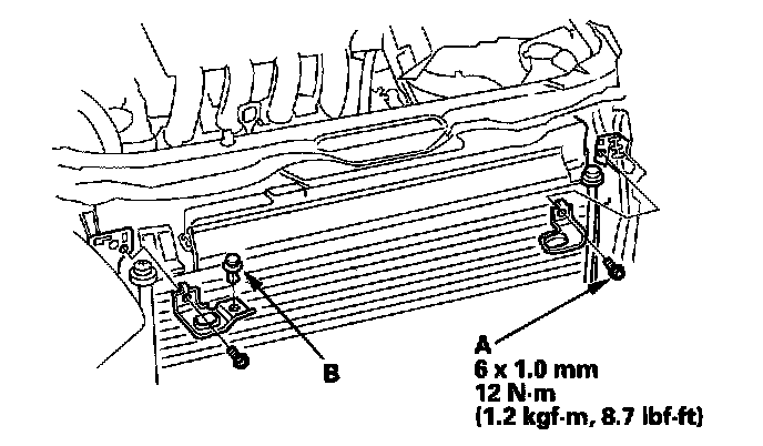 10. With A/C: Remove the A/C condenser upper brackets (A) and clip (B).