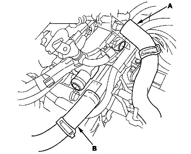 13. Remove the radiator upper hose (A) and the lower radiator hose (B).