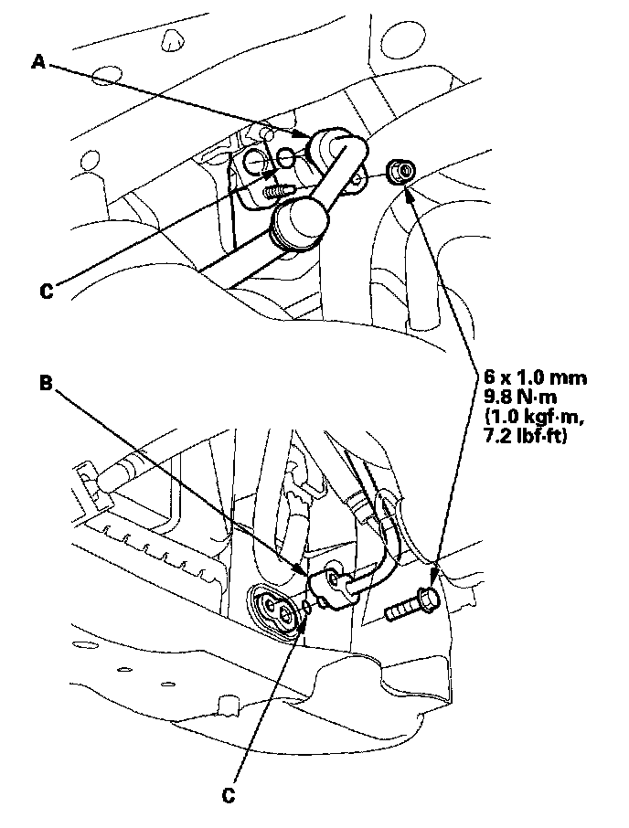 3. Remove the bolt and the nut, then disconnect the discharge line (A) and the receiver line (B) from the A/C condenser, remove the O-rings (C). Plug or cap the lines immediately after disconnecting them to avoid moisture and dust contamination.