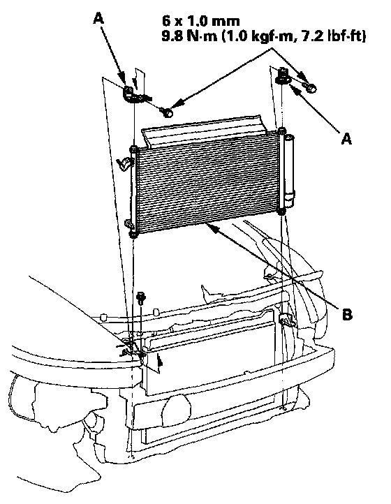 4. Remove the mounting bolts and the upper brackets (A), then remove the A/C condenser (B) by lifting it up. Be careful not to damage the A/C condenser fins when removing the A/C condenser.