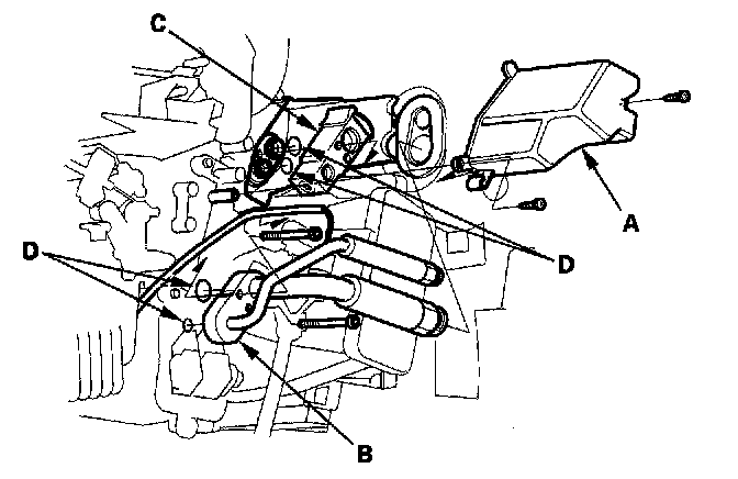 4. Remove the self-tapping screws and the pipe cover (A), then remove the bolts, the inlet and outlet pipes (B), the expansion valve (C), and the O-rings (D).