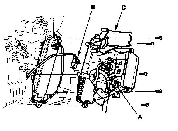 5. Disconnect the connector (A) from the evaporator temperature sensor, then remove the connector clip (B) Remove the self-tapping screws and the duct (C).
