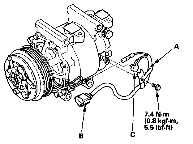 A/C Compressor Thermal Protector Replacement1. Remove the bolt and the holder (A). Disconnect the field coil connector (B), then remove the thermal protector (C).