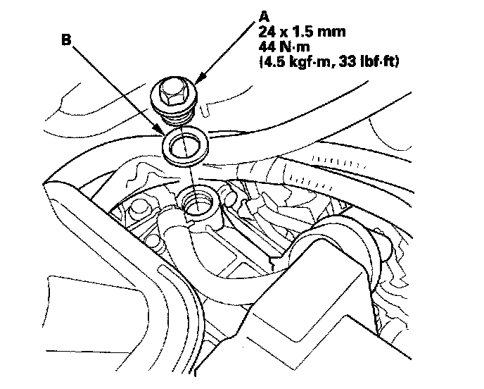 8. Install the filler bolt with a new sealing washer (B).