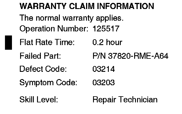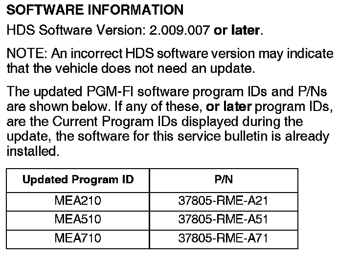 Update the PGM-FI software with the HDS and software version 2.009.007 or later. Refer to Service Bulletin 01-023, Updating Control Units/Modules.