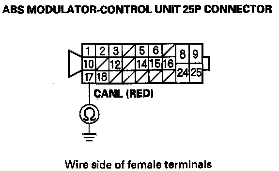 14. Check for continuity between ABS modulator-control unit 25P connector terminal No. 17 and body ground.