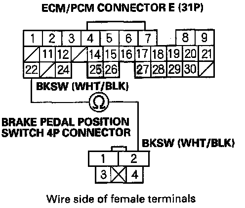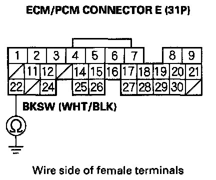 9. Check for continuity between ECM/PCM connector terminal E22 and brake pedal position switch 4P connector terminal No. 2.