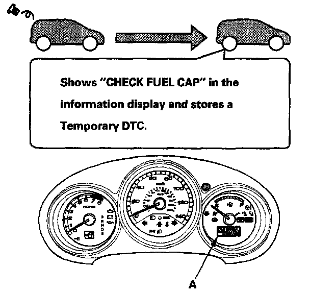During the first drive cycle after a cold start, the ECM/PCM alerts the driver to check the fuel fill cap by showing a "CHECK FUEL CAP" message in the information display (A), and it stores Temporary DTC P0457 "Evaporative Emission (EVAP) System Leak Detected/Fuel Fill Cap Loose or Missing". Tightening the fuel cap does not make the message go off immediately.