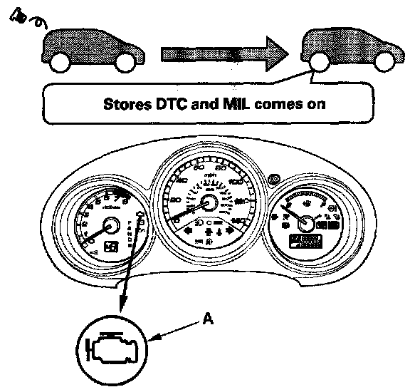 During the third drive cycle after a cold start, if the fuel fill cap is still loose or missing, the ECM/PCM stores DTC P0457 "Evaporative Emission (EVAP) System Leak Detected/Fuel Fill Cap Loose or Missing." The malfunction indicator tamp (MIL) (A) comes on, and the "CHECK FUEL CAP" message goes off.