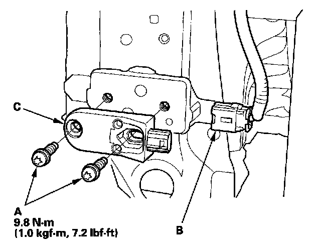 1. Install the new front impact sensor with a new TORX bolts (A), then connect the engine compartment wire harness 2P connector (B) to the front impact sensor (C).