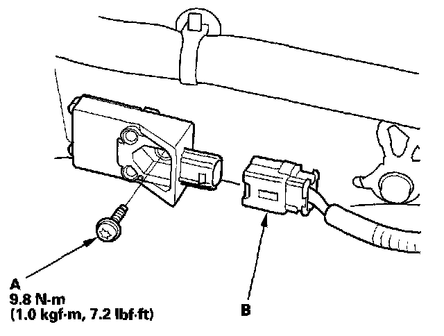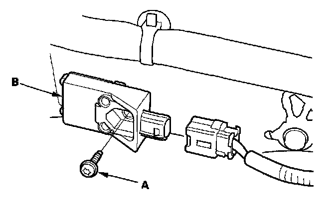 1. Install the new side impact sensor (first) with the TORX bolt (A), then connect the floor wire harness 2P connector (B) to the side impact sensor (first).
