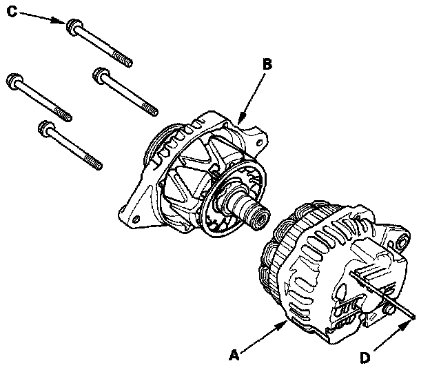 6. Separate the rear housing (A) and the drive-end housing (B) with the stator (C) attached to the rear housing.