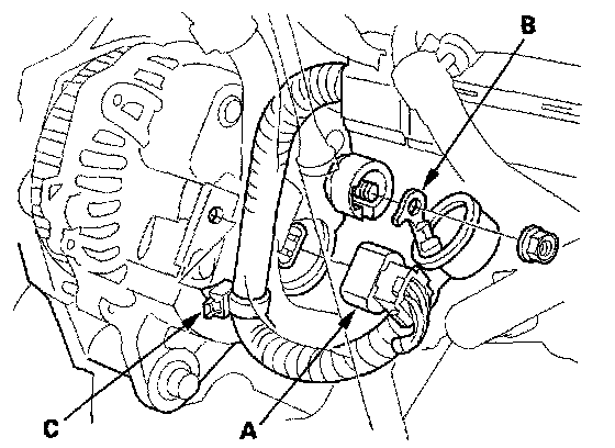 5. Disconnect the alternator connector (A), the BLK wire (B) and the harness clamp (C) from the alternator.
