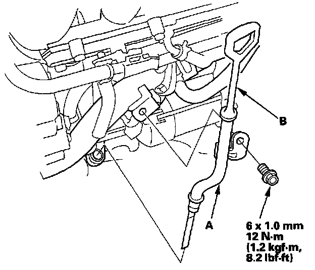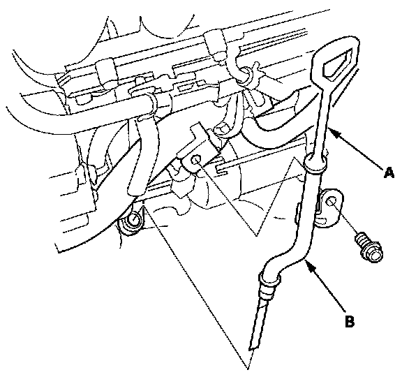 3. Remove the dipstick (A) and the dipstick tube (B).