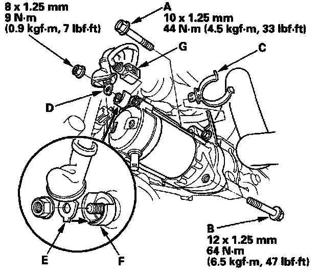 1. Install the starter, then loosely install the upper mounting bolt (A) and the lower mounting bolt (B).