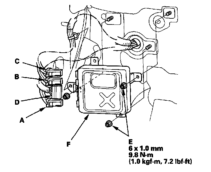 6. Remove the nuts (E) from the EPS control unit (F).