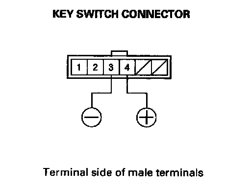 3. Connect the battery positive terminal to key switch connector terminal No. 4, and connect the battery negative terminal to terminal No. 3, then check that the ignition key cannot be turned to LOCK (0). Remove the battery terminals, and make sure that the key can be turned to LOCK (0) position and removed from the cylinder.