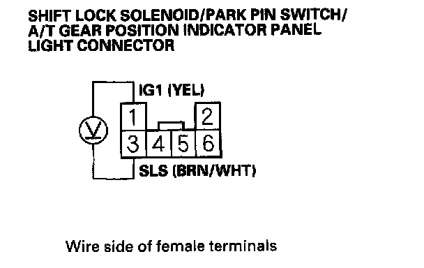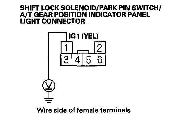 6. Measure voltage between shift lock solenoid/park pin switch/A/T gear position indicator panel light connector terminal No. 1 and body ground.
