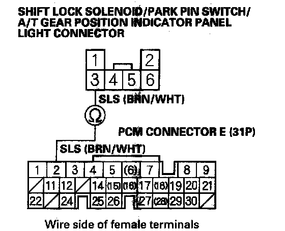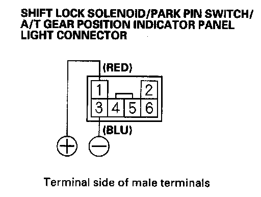 NOTE: Do not connect the battery positive terminal to terminal No. 3 or you will damage the diode inside the shift lock solenoid.